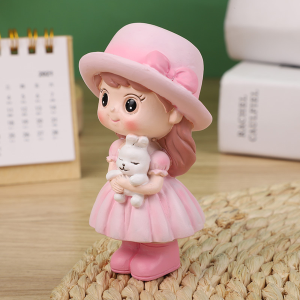 Bé gái đứng MŨ HỒNG ôm thỏ SỨ