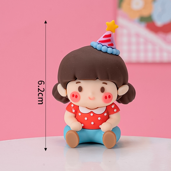 Kute Bé Gái NGỒI áo chấm bi CAM + Má Hồng đội mũ sinh nhật NHỰA ĐẶC