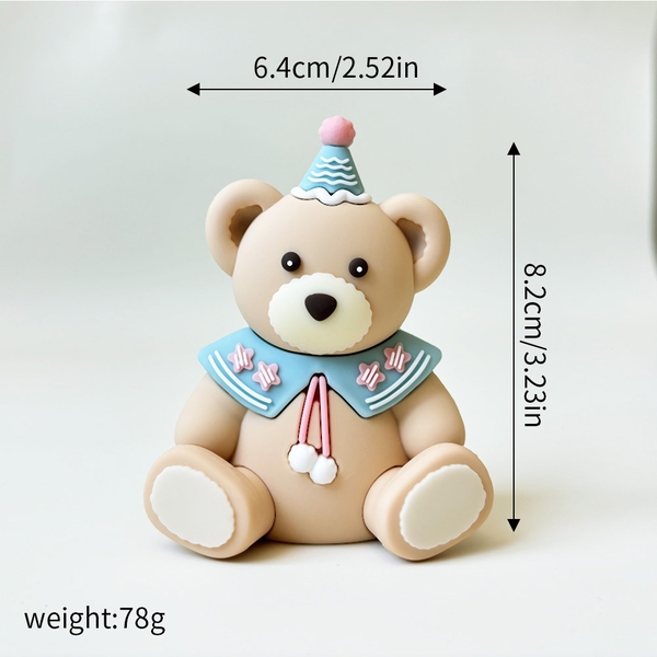 Kute gấu ngồi màu nâu nhạt yếm xanh mũ xanh chóp hồng (8,2cm)