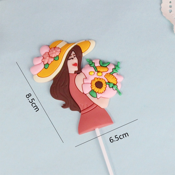 Kute slc cố gái váy hồng mũ rộng vành ôm bó hoa
