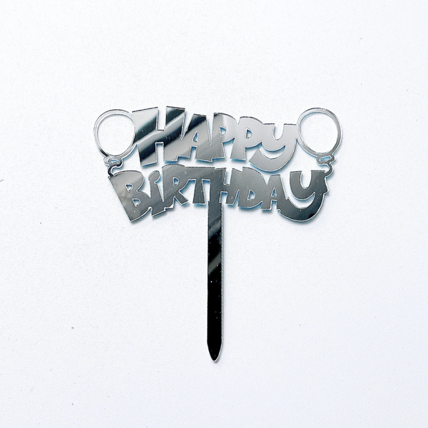 Topper mica HPBD bóng bay màu BẠC chữ in nét đậm