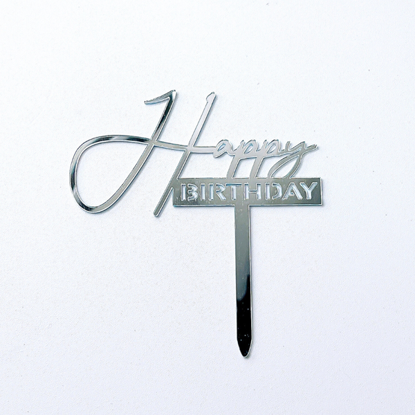 Topper mica HPBD màu BẠC chữ Happy nghiêng ( chữ H to mới )