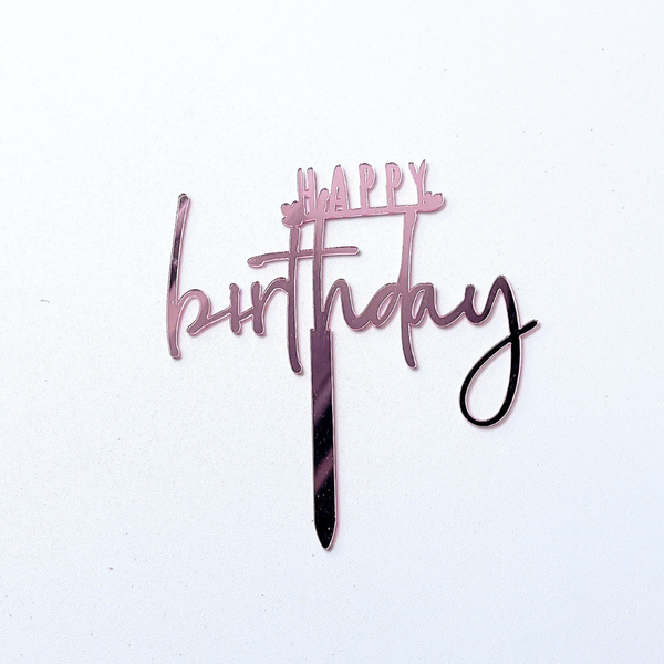 Topper mica HPBD màu HỒNG chữ HAPPY in gạch chân nét mảnh + 2 trái tim nhỏ