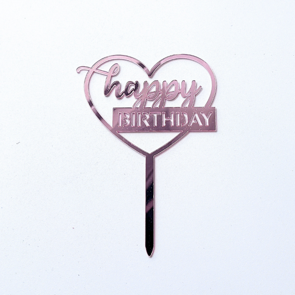 Topper mica HPBD màu HỒNG chữ thường in + TRÁI TIM TO