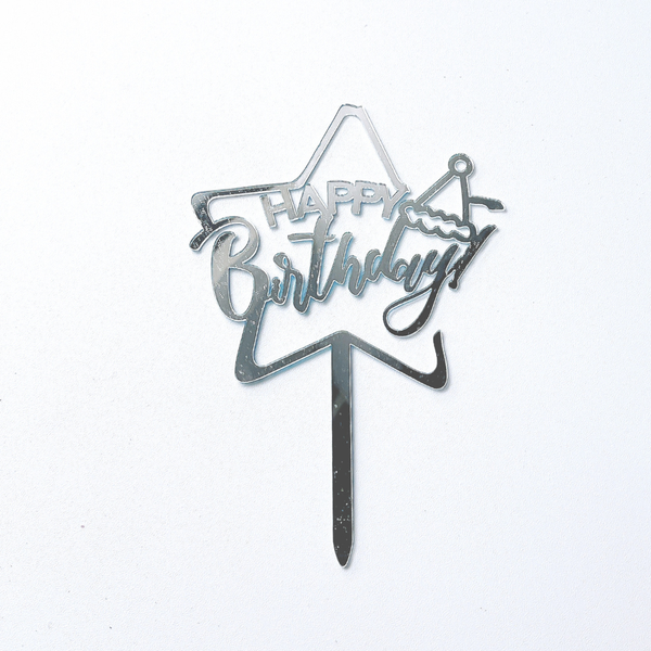 Topper mica HPBD SAO TO + MŨ SINH NHẬT màu BẠC