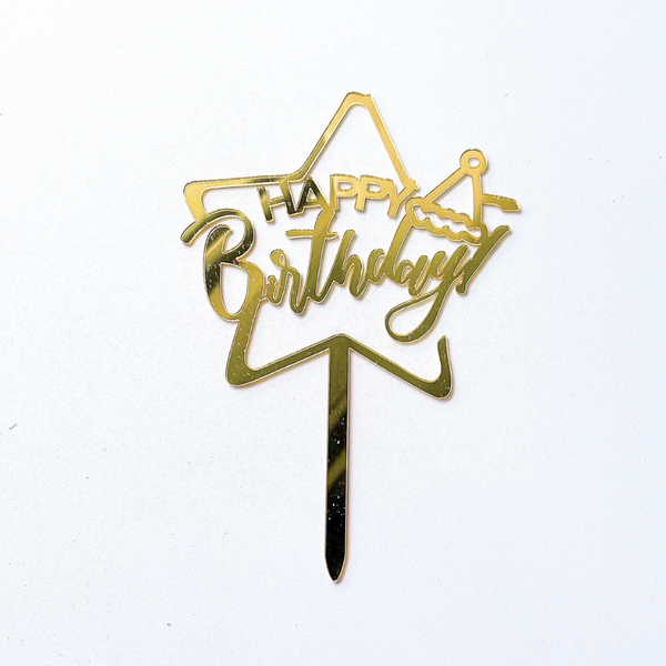 Topper mica HPBD SAO TO + MŨ SINH NHẬT màu VÀNG