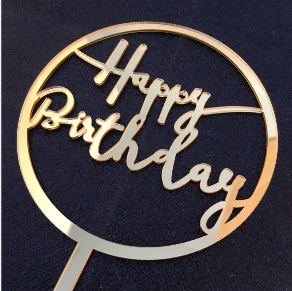 topper mica HPBD vàng 1 vòng tròn chữ hoa nét nhỏ