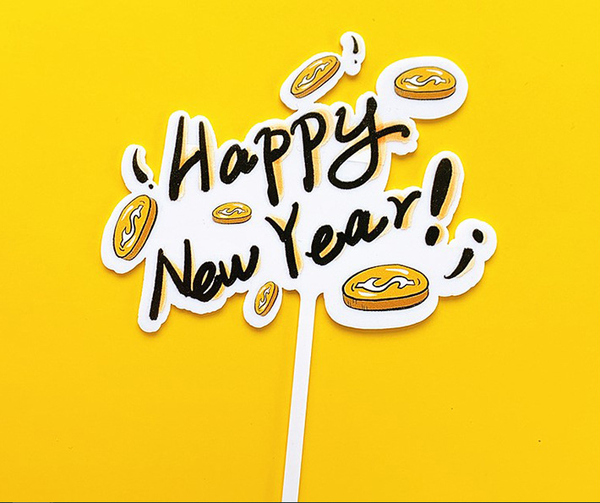 Topper mica HPNY Chữ đen nền trắng+đồng xu