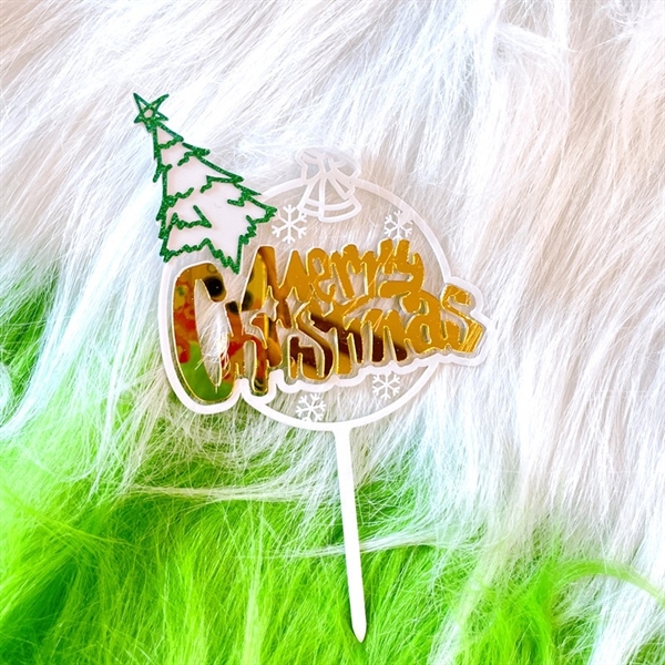 Topper mica MC Vòng tròn TRẮNG chữ VÀNG cây thông+nơ chuông trắng
